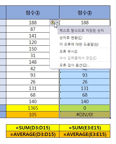 점수②의 188 셀을 선택하면,