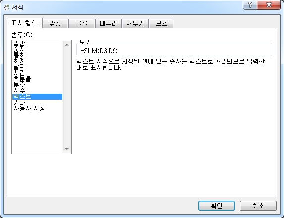 셀 서식이 "텍스트"로